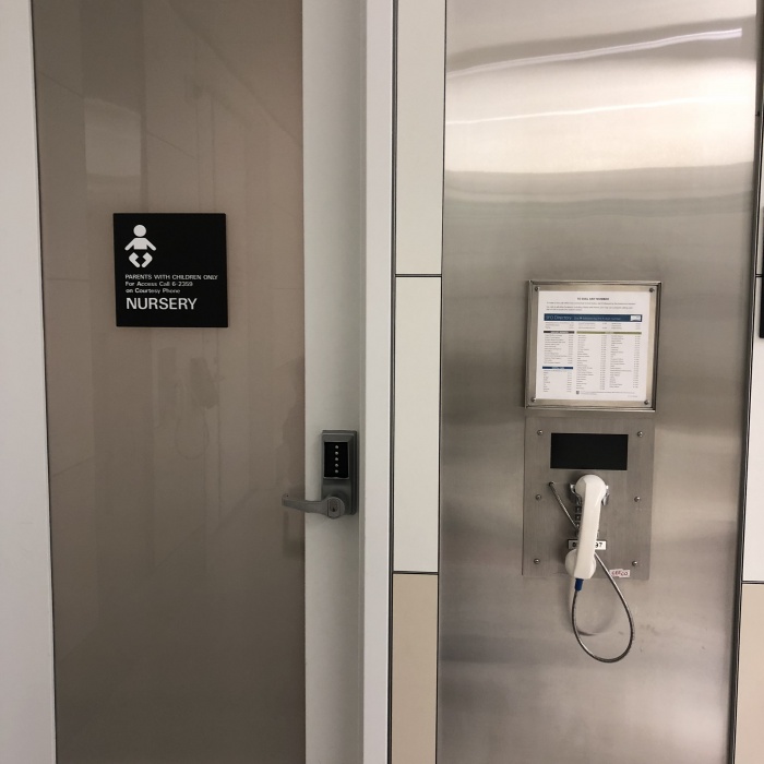 Located near the restrooms before security, the nursery requires an access code which you can easily get from the courtesy phone next to it. Once you're inside, there's a chair for nursing or feeding, a diaper changing table, a sink, paper towels, soothing music and even a diaper vending machine (It's $2 for a diaper and some wipes.)