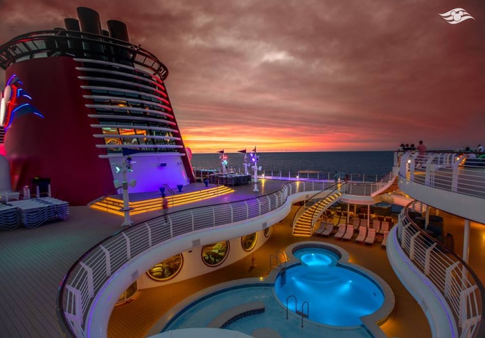 They lay the dance floor right over the pools, so once that is done make your way to the front, as close to the jumbo movie screen as possible. That is where the show will take place at 4:30. If you can't get near enough for your girls to be able to see, head up a deck and you should be able to get right in front with a perfect arial view. When the show is over and the ship is officially underway, the pools will reopen.