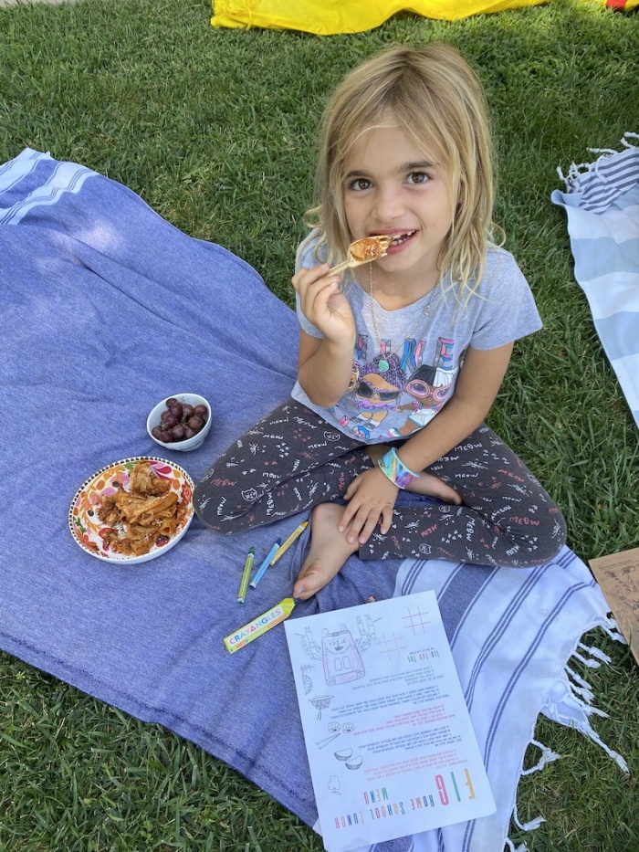 Each day of the week has a different menu, usually with three options. You can peep the full menu here. For a recent Wednesday, we ordered the Mac n' Cheese and the Pasta Shells with Meat Sauce. Each came with a side order of grapes and garlic bread as well as two Crayangle crayons and a sheet to play some Tiktaktoe. Each meal is $15. Pick-up is offered or if you live in the Santa Monica area you can have it delivered.