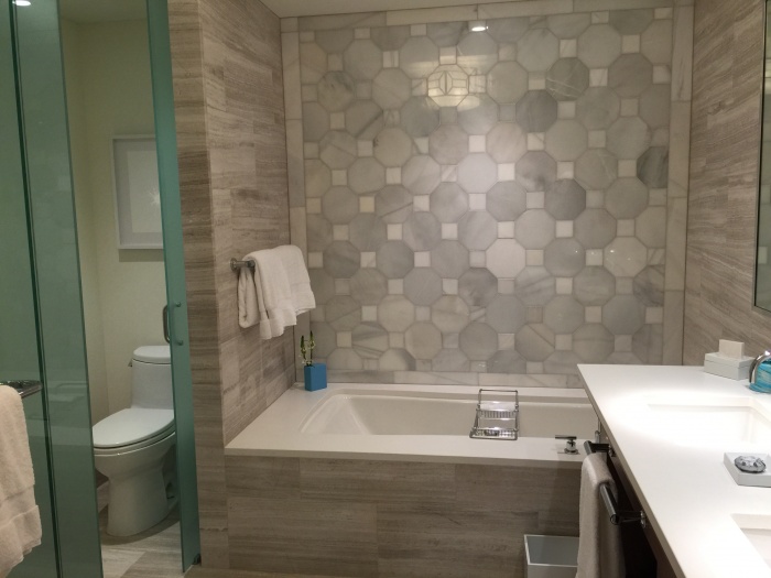The bathroom, like the rest of the room, is luxurious and sophisticated, meaning you don't have to sacrifice your penchance for design and style while staying with your kids. (We would be careful bathing toddlers in the bath though.)