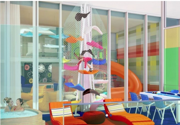 Set to debut on the new Symphony of the Seas ship this spring, the Ultimate Family Suite is a two-story suite that can sleep up to eight people. But this suite is not just about more space for everyone to hang out. It also comes with a tube slide that sends people from a loft bedroom down to the main floor, a private cinema, a pool table and kid-friendly climbing structure on the wrap-around balcony, an air hockey table and a floor-to-ceiling Lego wall. Judging from the rendering below it looks like a hot tub is included too.