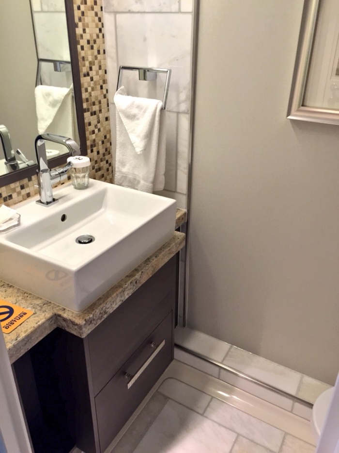 This is a shot of a Family Junior Suite, specifically room 10-21. It has two baths, one king bed and one sofa bed. It also has its own private balcony. Now, here's what the bathrooms look like. Not bad for a boat!