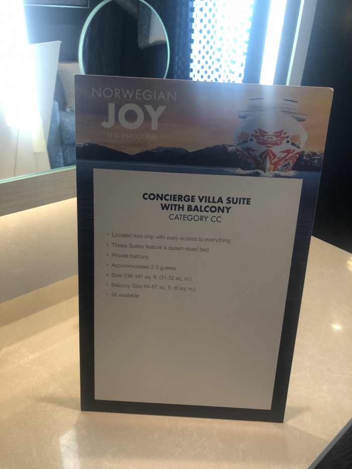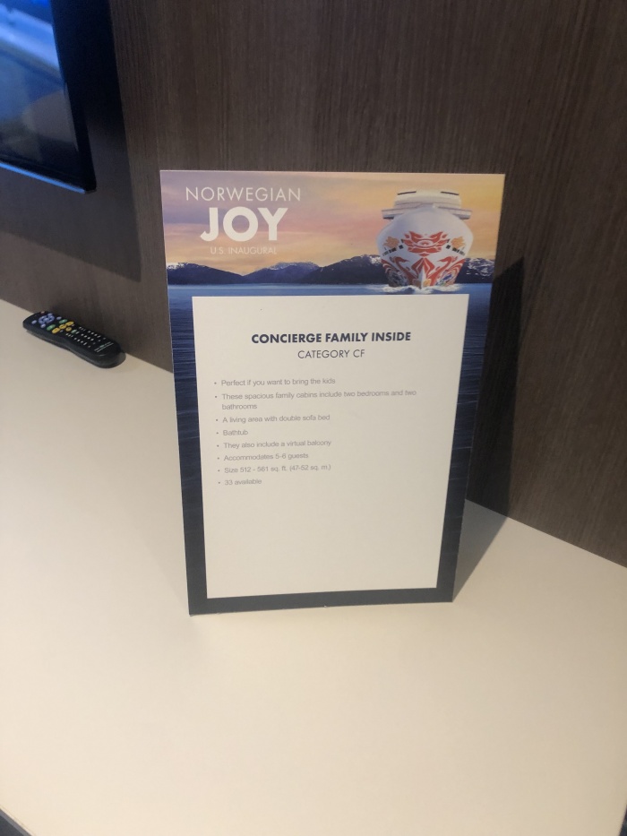 These are most of the room types on the ship with the exception of The Haven, the ultra-exclusive hotel atop the ship. As for the Concierge level, this category is one notch above the regular Joy staterooms and will get you priority dining at select restaurants but other than nicer decor and different toiletries, it's nothing like the services and amenities of The Haven.