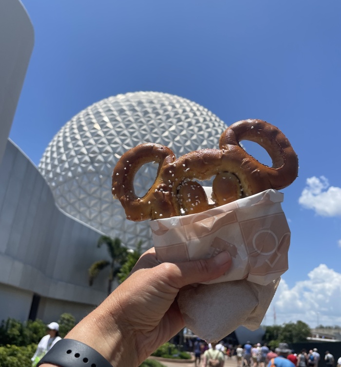 After this back-to-back-to-back ride rush, we cooled off with some frozen Coca-Colas slushies and a giant Mickey-shaped pretzel with cheese. We kept the merchandise to a minimum, buying only Star Wars-themed misting fan, since we did some damage at the market at Contemporary Resort, buying pins, pretzel ears, dog t-shirt and jewelry.