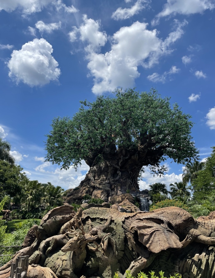 At Animal Kingdom, the first thing we did was walk around the Tree of Life which I'd been dying to see in person. And it didn't disappoint. Be sure to walk the path around the tree so you can see all the detail of the tree carvings. Next up was the Kilimanjaro Safari ride. However, for this we used Genie+. The Genie+ feature on the Disney app, which you can purchase the day of your park visit, is an extra $15 per person but it's worth it for minimizing wait times. (More on this below.) We nabbed the Kilimanjo Safari ride for about an hour after we arrived. As its name suggests, it's a mock safari ride showing off some of the animals of Animal Kingdom. Highlights of this were the baby rhinos and giraffes of course!