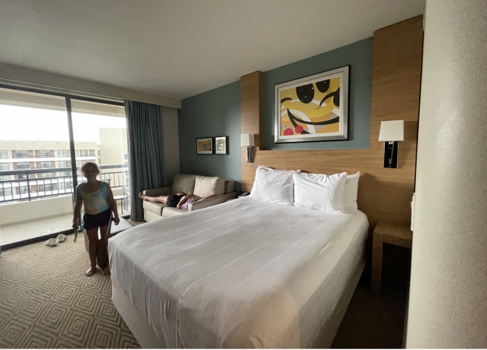 The room is tiny and not cheap, about $600 a night. The girls slept on the pull-out and I slept in the queen bed. But it does have that little kitchenette with a sink, microwave, small refrigerator, toaster and plenty of shelves which made it possible to store our snacks and make small meals (breakfast.) The room is comfortable for one adult and two children. Two adults might feel cramped. Of course, you'll spend most of the day in the parks but when you need to sleep at night, you may want more space.