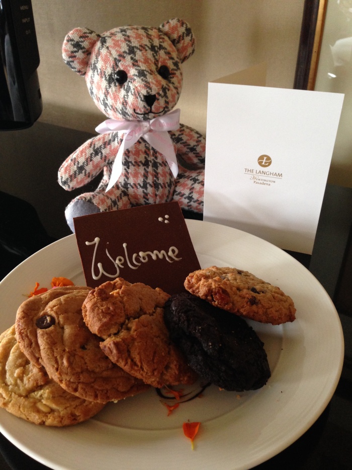 During our stay, we were greeted by this pink and grey houndstooth-checked Langham teddy bear “holding” a plate of cookies, with milk placed in the mini-bar.